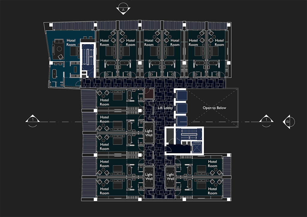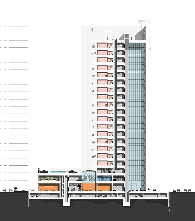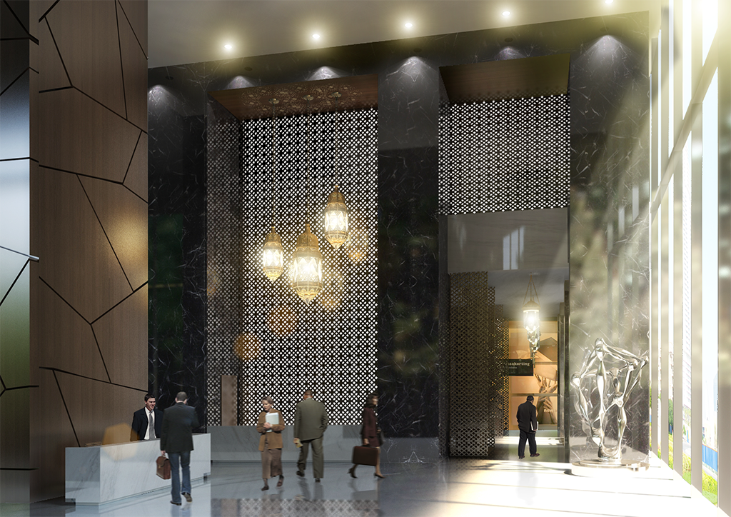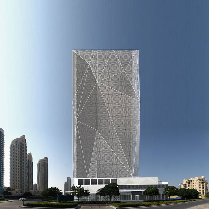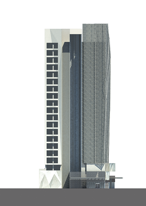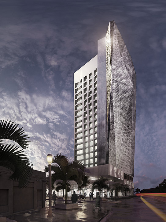 Invited competition entry for a 5 star business hotel integrating local heritage and urban context through a contemporary mashrabiya façade and golden spiral–aligned massing.