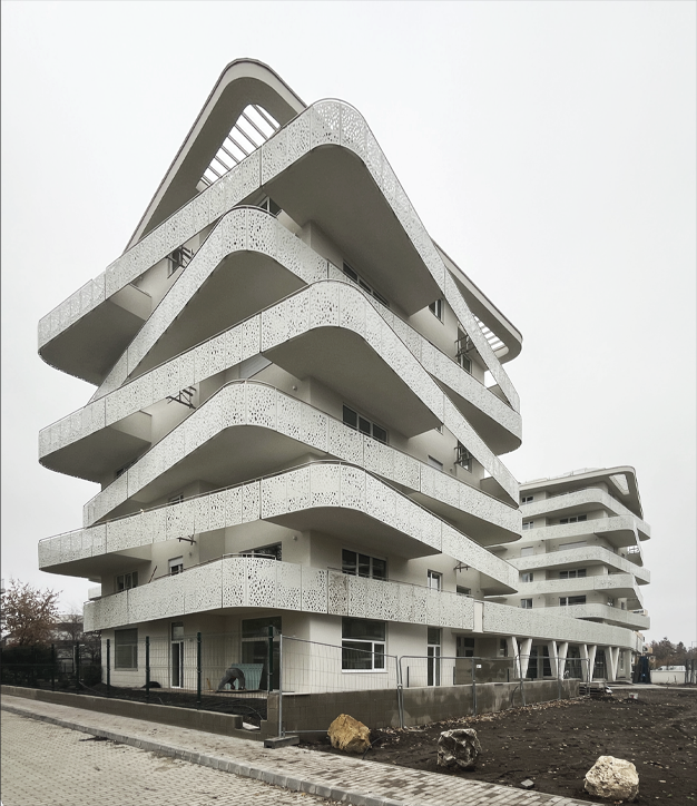 A budget-conscious development with residential twin towers over a commercial podium to maximize views, characterized by a clean white finish and distinctive perforated balconies.
